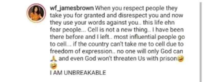 “Cell is not a new thing.. I have been there before and I left.. most influential people go to cell… if the country can’t take me to cell due to freedom of expression.. no one will only God can and even God won’t threaten Us with prison I AM UNBREAKABLE,” James wrote on Instagram.